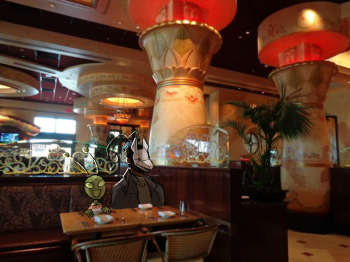 "I'm so glad we didn't run away when the giant monster popped out, we're the only ones in this Cheesecake factory!"