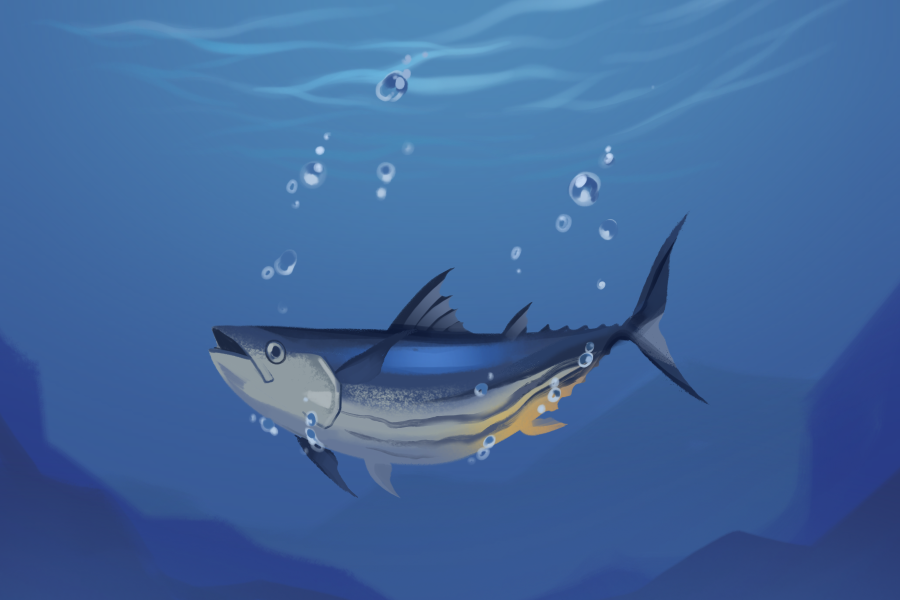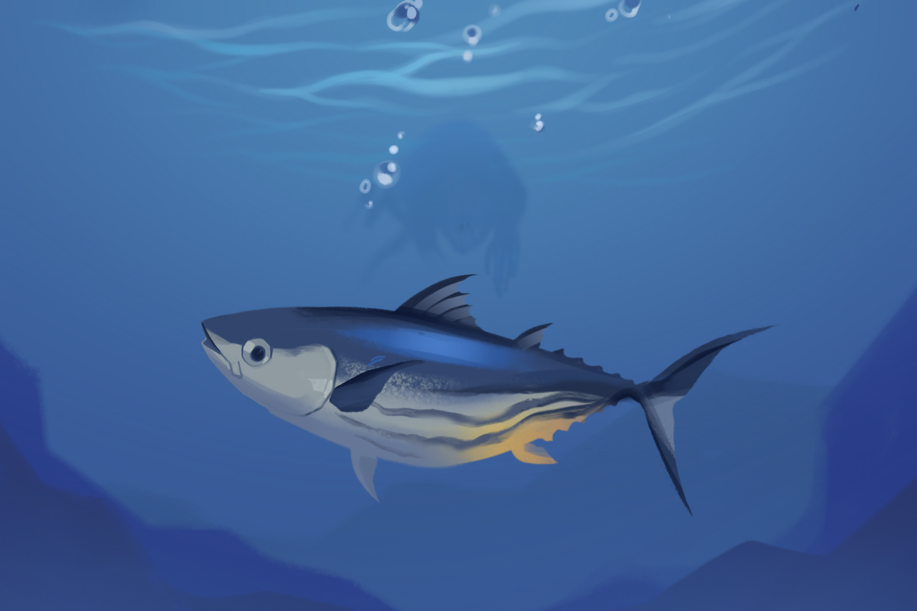 Captain Naut saw something in the distance. Originally he assumed it to be a bomb, but after darting, he noticed it was his beloved Pierre. He felt a great joy in his heart. Pierre must have followed his body down, and watched him transform. He thought his beloved son had been killed in the bombing. This was going to be the start of something new. As a fish, he could train the animals of the sea to protect themselves. Fight back against the horrors from above and stay away from danger. He calls out in excitement to his friend Pierre.