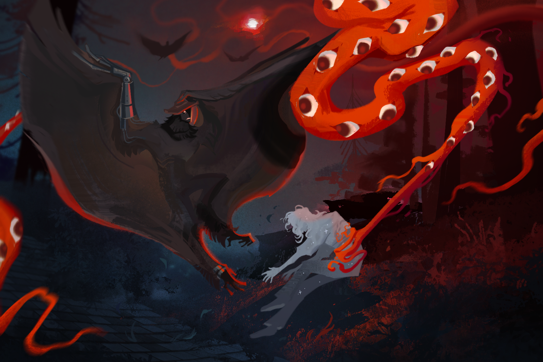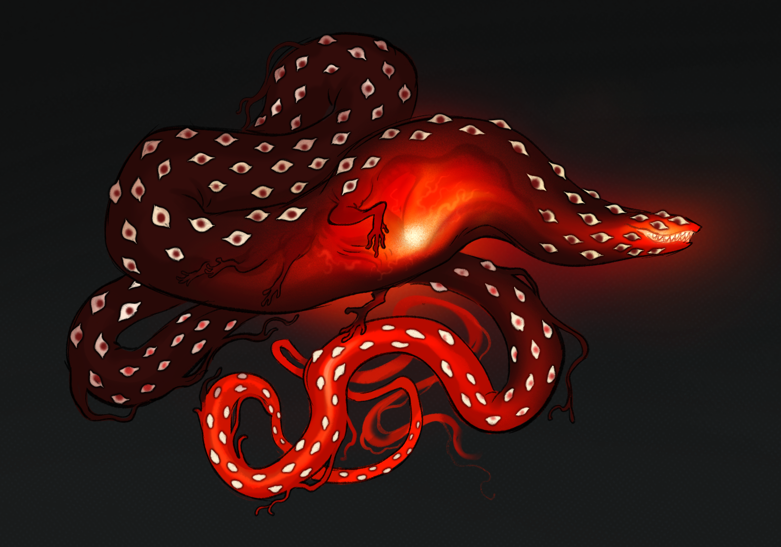 Formless, unable to think, he grips. Or he thinks he grips, he's not entirely sure. In a way, this feels just like the showtime punishment, while also simultaneously exactly unlike it. The ground splits into paths. Those paths split into lines. Those lines split into light. His eyes hurt. He realizes if he keeps gripping he's going to dig his nails right through his palms. He releases his grip. Or he thinks he does, he's not entirely sure.