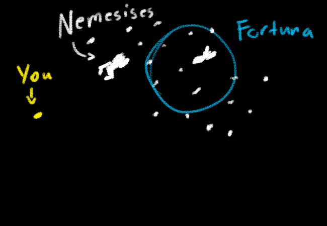 The Nemesis ship is small to large with a lot of power. Many have reported that after coming in contact with a Nemesis ship, or crew member from one they felt like they had average luck. Crew members report the want to find Fortuna and destroy it. Nemesis ships can be seen in flocks in areas said to be near Fortuna.
