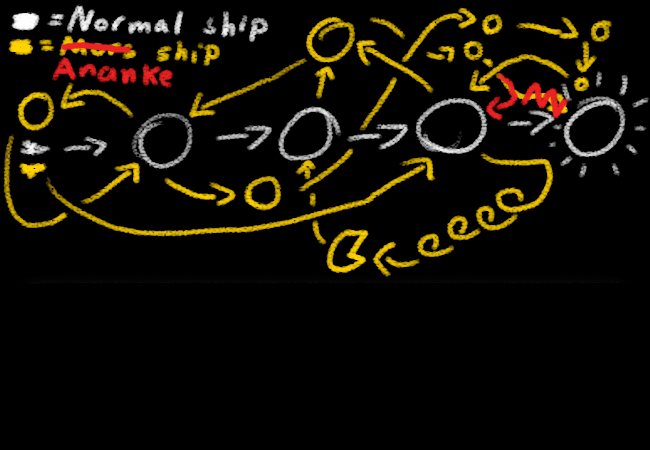 The Ananke ship is an uncontrollable ship as soon as you start it. Said to be an experiment, the Ananke ship is self-sufficient in the sense of fuel and repairs. All other ships refuse to attack it. Many people just jump on Ananke ships to "see where fate takes them." You may not refuse any passenger who gets on "your" Ananke ship.