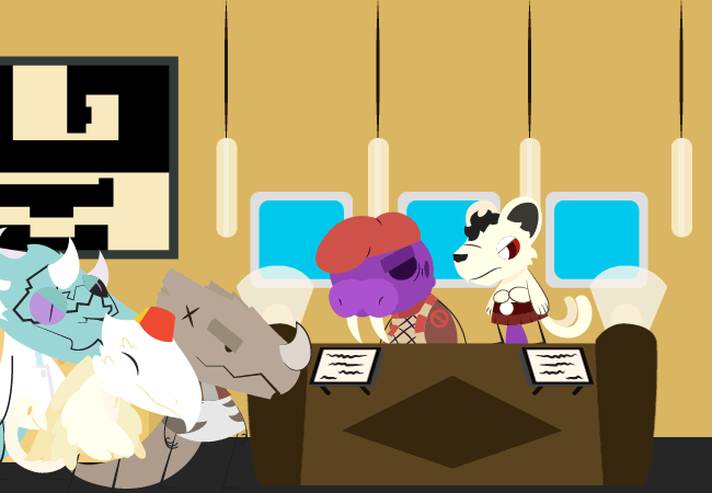 Noverus walks in front of the rest of the crew as they march over to the hotel. Nova has a quick chat with Fergus and he leads the crew to the elevator. He notes that he'll be waiting at the front desk for them.