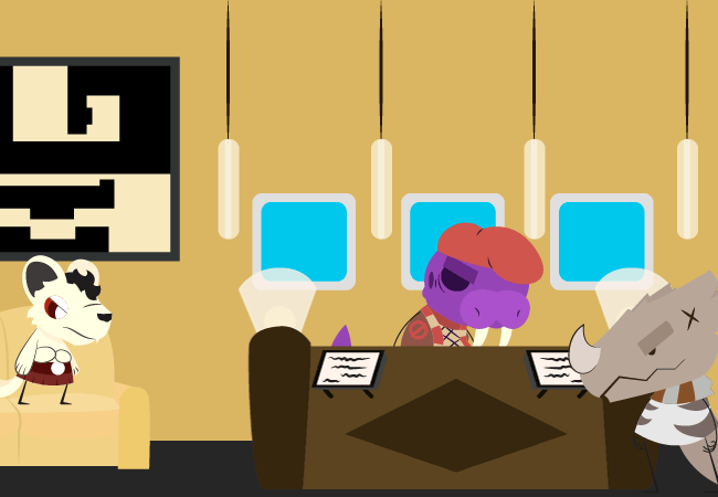 Once on the ground floor, Noverus walks to the front desk while the rest of the crew waits to the side.