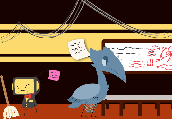 Apollo makes his way to the other side of the room to grab a mop and a towel.