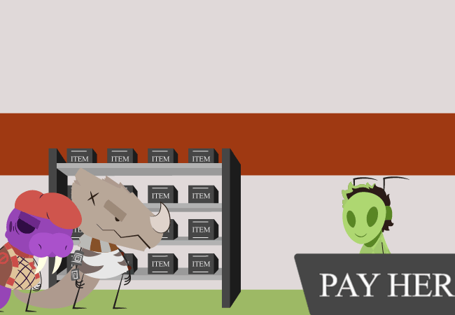 Nova and Fergus enter the store. The store is small. All the items are in black boxes labeled only “ITEM”. The prices for said “ITEM” is labeled as “PRICE”.