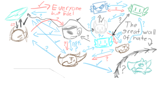 [Cea calms himself down. He knows he can’t call out to his best friend because he wouldn’t want anyone questioning who he was talking to. He decides to review his relationship chart. He questioned why he made a visual chart, not only was he no artist, but the list was crowded at this point.]