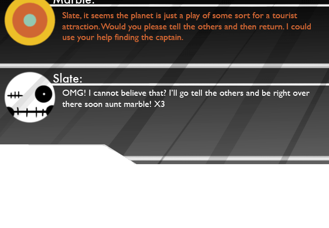[Back at the ship, Slate receives a text message from Marble. He feels anger starting to boil up. He didn’t care that the planet was one big hoax; he just wanted to stay inside his room. He hated always having to leave the ship to do work. Marble always dragged him around in an attempt to “help” him or because she had no idea what he wanted. He decided today was the day. He tried to say no in the vilest way possible so Marble understood what he really was like, but was unable to.]