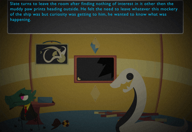 Slate turned to leave the room after finding nothing of interest in it other than the muddy paw prints heading outside. He felt the need to leave whatever this mockery of the ship was, but curiosity was getting to him. He wanted to know what was happening.