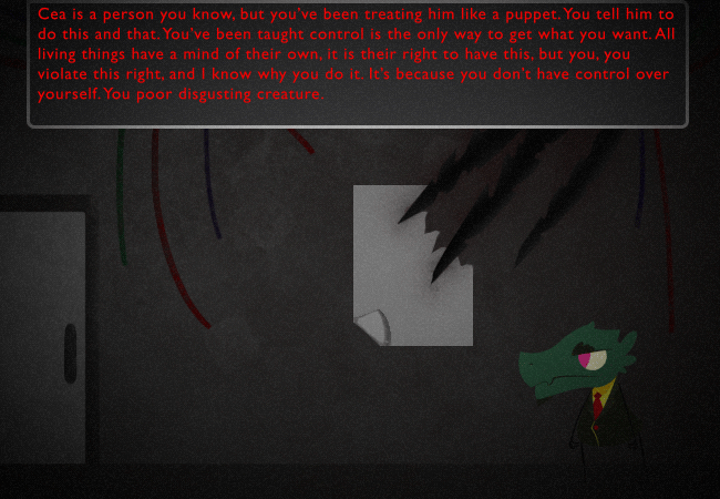 Cea is a person, you know, but you’ve been treating him like a puppet. You tell him to do this and that. You’ve been taught control is the only way to get what you want. All living things have a mind of their own. It is their right to have this, but you, you violate this right, and I know why you do it. It’s because you don’t have control over yourself. You poor disgusting creature.