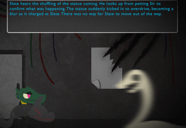 Slate heard the shuffling of the statue coming. He looked up from petting Sir to confirm what was happening. The statue suddenly kicked into overdrive, becoming a blur as it charged at Slate. There was no way for Slate to move out of the way.