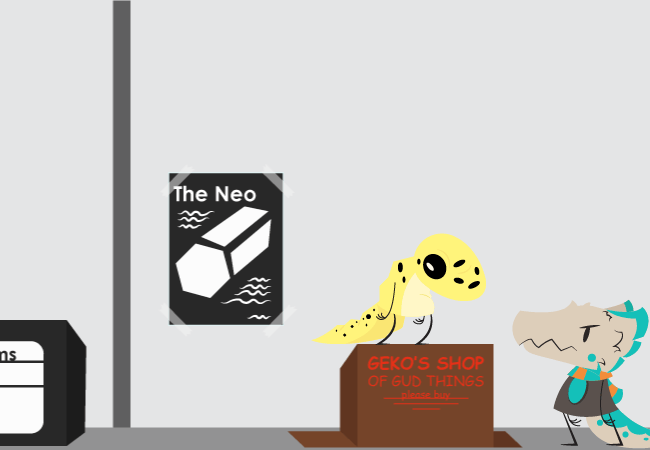 Cobalt enters the small store area and automatically spots a store labeled "Geko sell gud thigs". A geckrechaun sits on top of the cardboard box shop and wiggles his tail slightly, attempting to draw in new paying customers. There's another shop in the area, "Clockwork's anomalous items", but Cobalt decides first to ask the geckrechaun a question.
