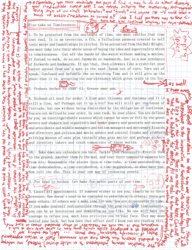 1. To be protected from the onslaught of time, one must realize that time innt real. It is an invention, a fib, a fallacious panacea created to sell tonic water and launch ships in circles. To be protected from the Dali Blight, one must take into their whole sense of being the idea and superreality which is timelessness. Cut off the hands of the watch without making a motion. If forced to walk, do so not forwards or backwards, but in a new synthesis of forwards and backwards. If not that, then sideways like a crab—let your cancer spread from one's spot in the sand. Speak out of turn. Turn out of speak. Confound and befuddle the on-watching Time and it will give up the ghost that it is, accepting the non-existence which gives truth to its lie.