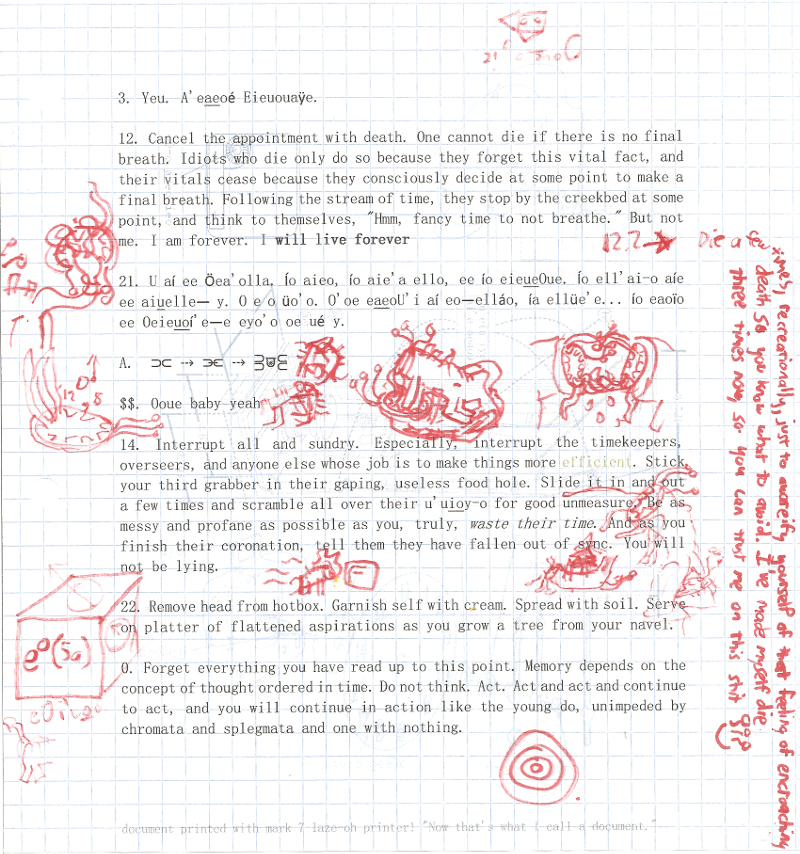 12. Cancel the appointment with death. One cannot die if there is no final breath. Idiots who die only do so because they forget this vital fact, and their vitals cease because they consciously decide at some point to make a final breath. Following the stream of time, they stop by the creekbed at some point, and think to themselves, "Hmm, fancy time to not breathe." But not me. I am forever. I will live forever