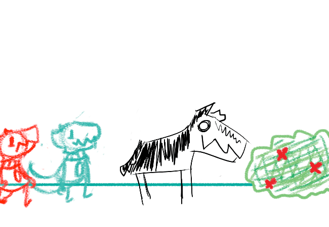 The doggy turns around and you're worried at first, but then the doggy comes to you and boops your light. The doggy starts whining at the bush. Your brother asks what he should do.