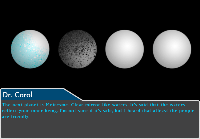 The next planet is Moiresme. Clear mirror like waters. It's said that the waters reflect your inner being. I'm not sure if it's safe, but I heard that atleast the people are friendly.