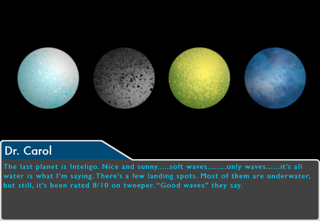 The last planet is Inteligo. Nice and sunny.....soft waves........only waves......it's all water is what I'm saying. There's a few landing spots. Most of them are underwater, but still, it's been rated 8/10 on tweeper. "Good waves" they say.