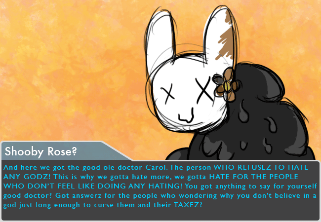 And here we got the good ole doctor Carol. The person WHO REFUSEZ TO HATE ANY GODZ! This is why we gotta hate more, we gotta HATE FOR THE PEOPLE WHO DON'T FEEL LIKE DOING ANY HATING! You got anything to say for yourself good doctor? Got answerz for the people who wondering why you don't believe in a god just long enough to curse them and their TAXEZ?