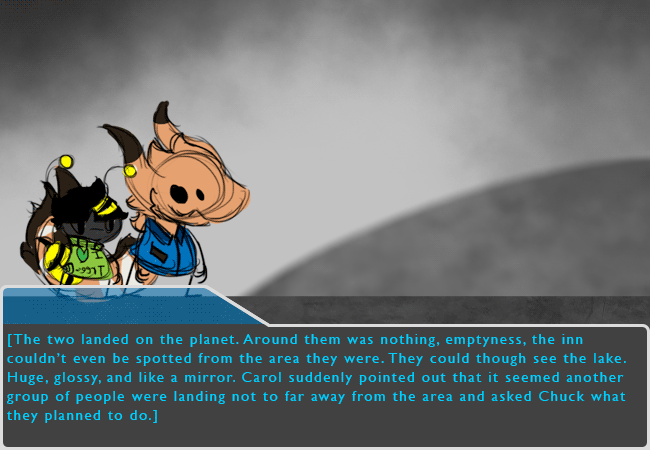 [The two landed on the planet. Around them was nothing, emptyness, the inn couldn't even be spotted from the area they were. They could though see the lake. Huge, glossy, and like a mirror. Carol suddenly pointed out that it seemed another group of people were landing not to far away from the area and asked Chuck what they planned to do.]