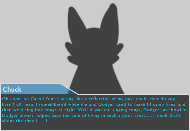 Oh come on Carol! You're acting like a reflection of my past could ever do any harm! Oh man, I remembered when me and Dodger used to make lil camp fires, and then we'd sing folk songs at night! Well it was me singing songs, Dodger just howled. Dodger always helped ease the pain of living in such a poor area...... I think that's about the time I......I.........