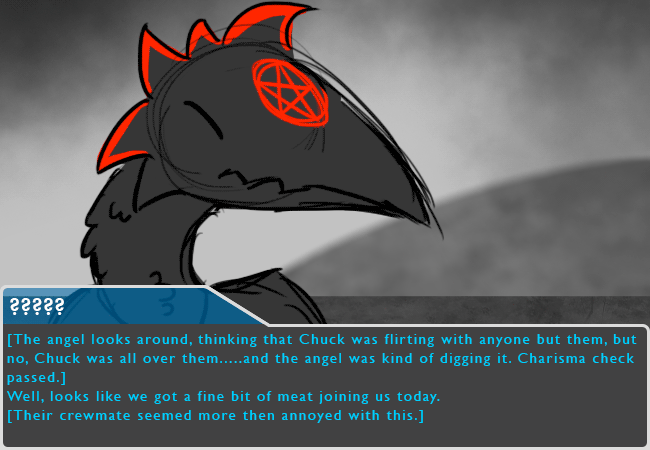 [The angel looks around, thinking that Chuck was flirting with anyone but them, but no, Chuck was all over them.....and the angel was kind of digging it. Charisma check passed.]