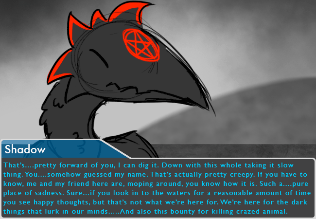 That's....pretty forward of you, I can dig it. Down with this whole taking it slow thing. You....somehow guessed my name. That's actually pretty creepy. If you have to know, me and my friend here are, moping around, you know how it is. Such a....pure place of sadness. Sure...if you look in to the waters for a reasonable amount of time you see happy thoughts, but that's not what we're here for. We're here for the dark things that lurk in our minds.....And also this bounty for killing crazed animal.