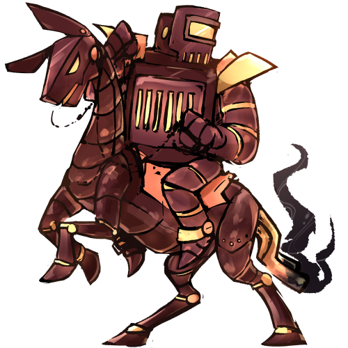The body and arms of the unit are securely framed and durable. Attacks from blades and flames cause no harm to a Hephaestus, as such one would assume it would be an excellent war AI, but regrettably, the Hephaestus lacks the typical mobility of one. Its legs are short, and its feet are only for show. Useless for holding it up. A small slot is in these legs for hooking up to a mount. Typically the mount is a donkey like AI, but steed types may change generation to generation. This steed, while an AI in its own right, is dimwitted, yet serves as a large memory bank for anything its rider wishes to store.