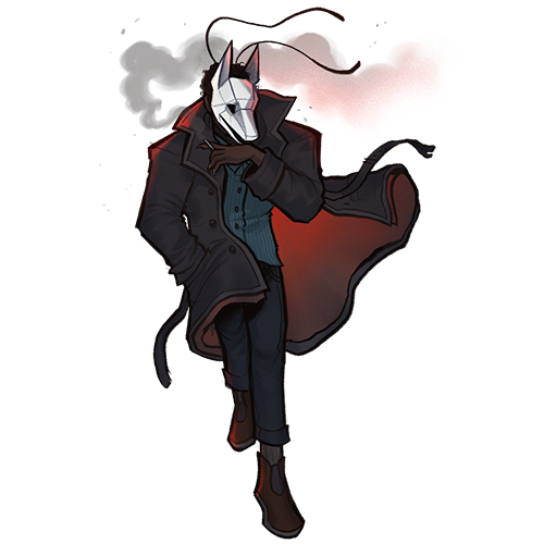 Angular as if made of polygons, his white mask is of a guard dog, ears pointed to await orders. Parts are painted black to form a delightfully surprised face of ":V". He is infamous for forgetting what expression he's supposed to sign off on and flips between ":V, :U, =U, and =V." Fellow notails are compelled to correct him, but he snaps at those who are not higher ranked than him.