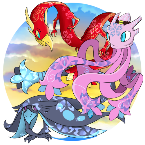 The dragon malventus are long and snake like in form, with a nearly flat body that they utilize to glide around on air currents. This form of the malventus is not all that dissimilar to the drakon, with the exception of being nearly flat like paper. Dragon malventus oftentimes have four bluntly pointed horns on their head, are vibrantly colored in shades of red, purple, green, or blue, and often have flower like patterns adorning their skin. The tail of a dragon malventus is splayed out in a flower petal like shape. Additionally, the dragon malventus have between two and three pairs of arms that can also be used as legs.